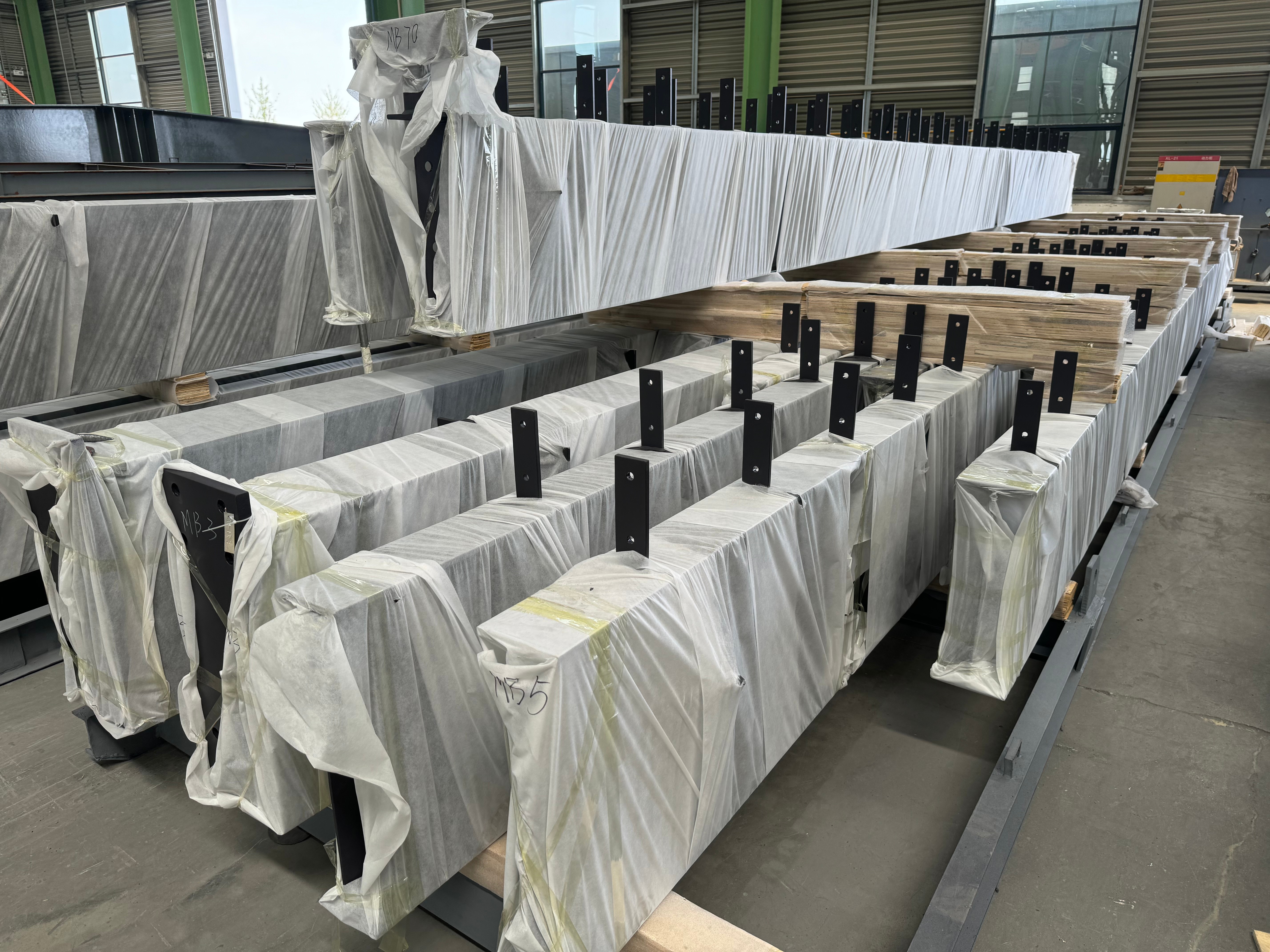 Apply a rust-preventive oil or VCI coating to all surfaces. Protect bolt threads, connection plates, and finished surfaces with caps, sleeves, or VCI paper. This prevents corrosion and damage during transit.