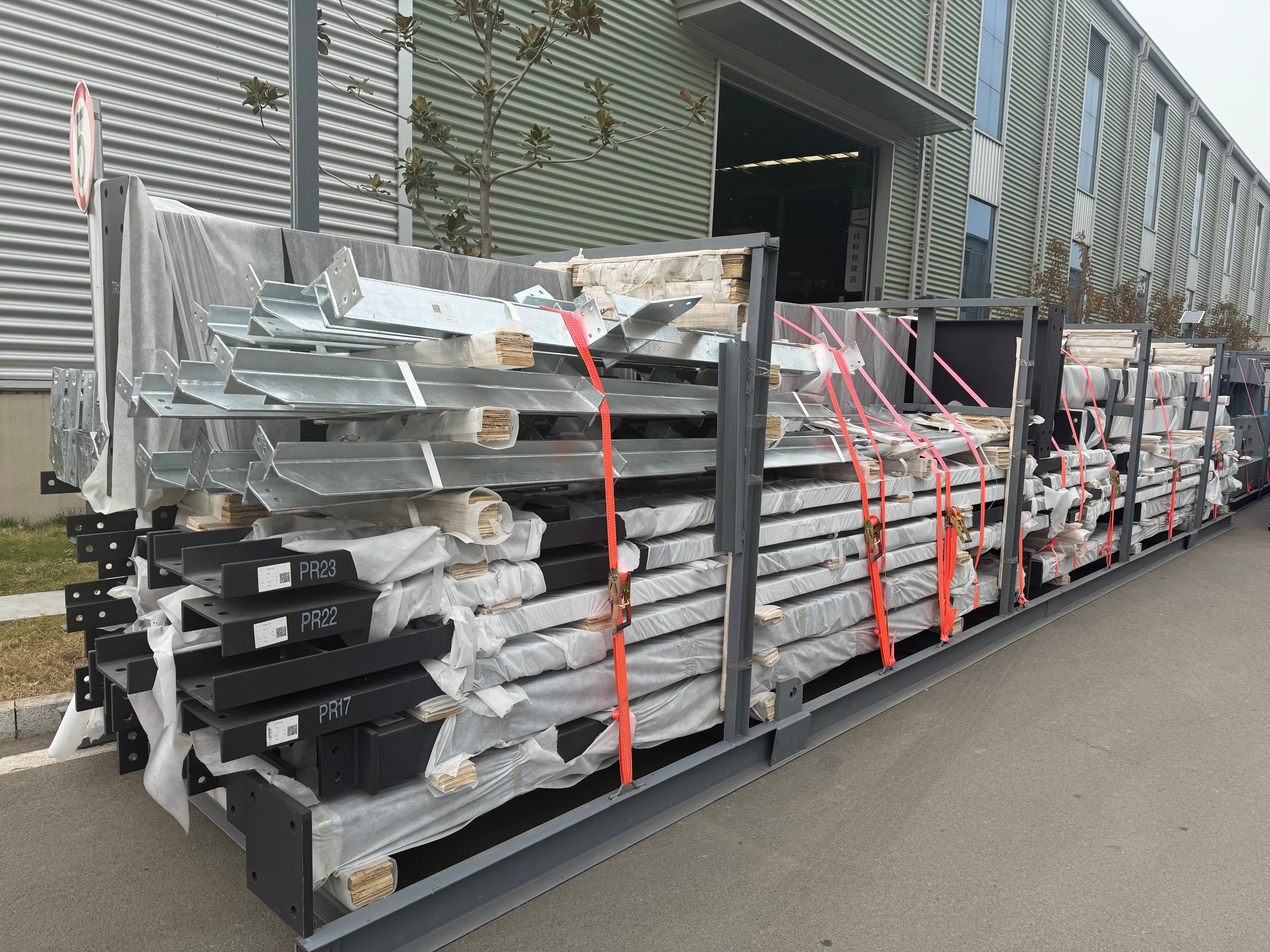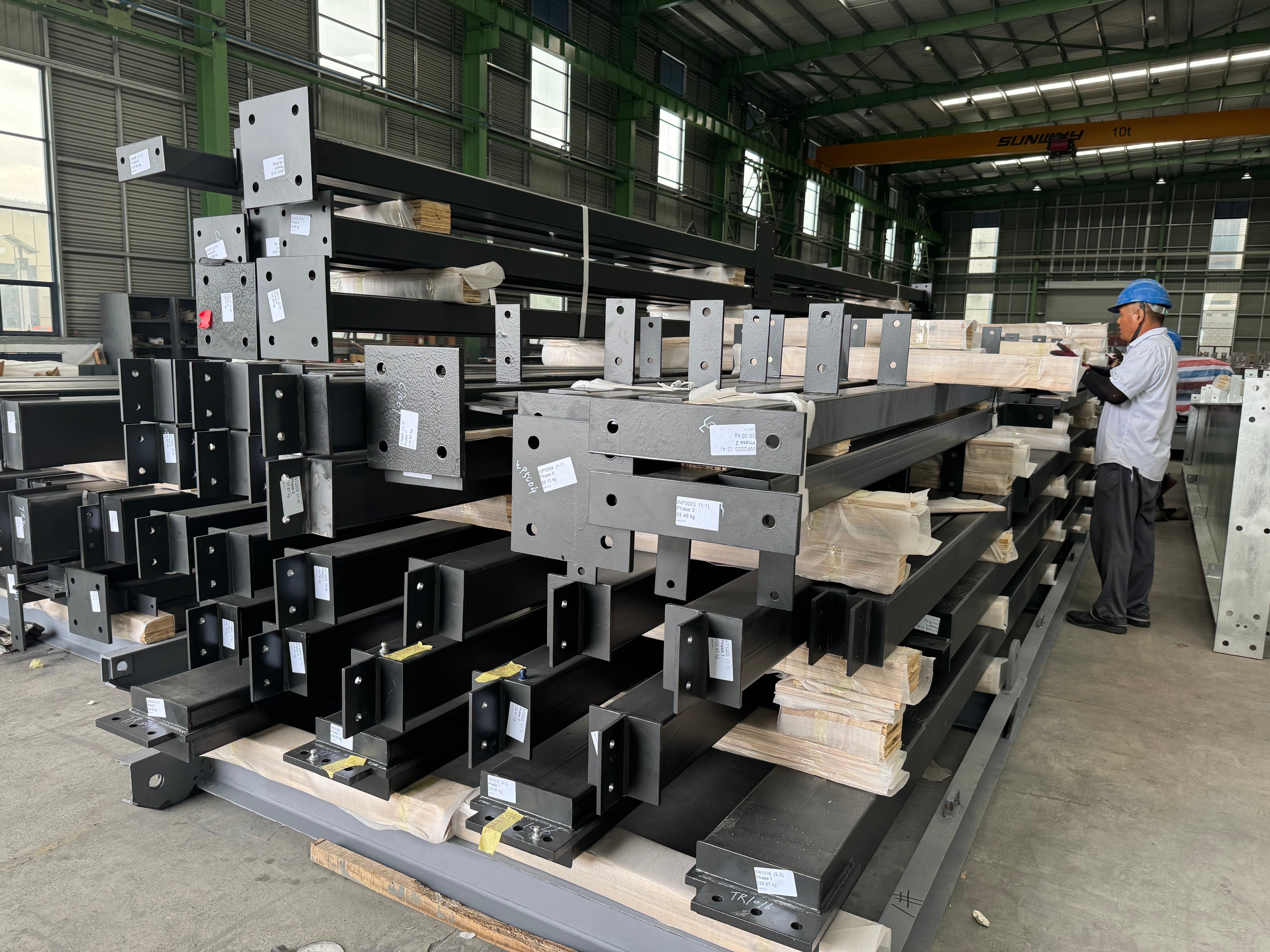 Group identical beams, columns, purlins, and bracings. Securely bundle them with heavy-duty steel strapping. Use timber dunnage between layers to prevent bending and allow for forklift access.